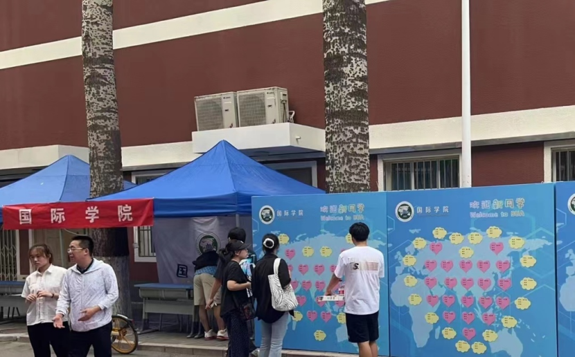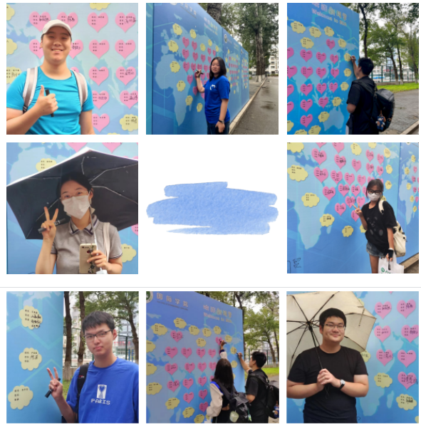 新生报到的地点设置在教学楼b的102教室和操场旁边的悟空体育服务台,每个班的两名班助负责确认新生报道情况和信息的录入,同时发放公司为每个小萌新准备的礼包,里面包括员工手册、入学指南、员工常见事务问答、公司新生教育和军训安排表等等。整体迎新工作行云流水,有条不紊,新生们还纷纷打卡精心布置的迎新签名墙、留下自己的名字,记录步入大学时刻。