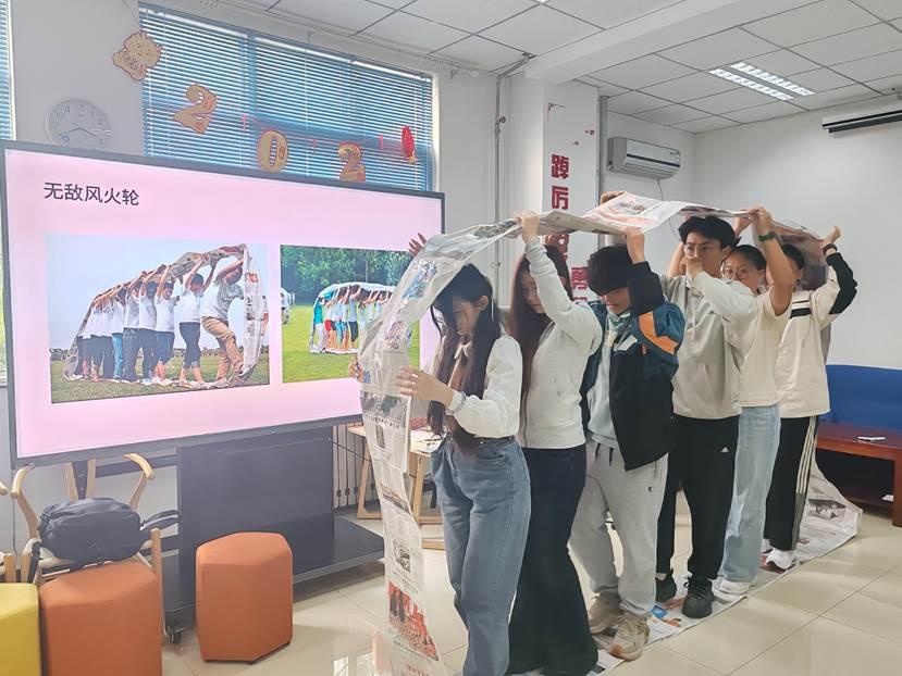 在“阳光伙伴”计划成员带领下,破冰游戏“大风吹”迅速吹走了陌生和距离。新生宿舍长们紧锣密鼓的分组进行了名为“无敌风火轮”的团队合作游戏。利用报纸和胶带,各组齐心协力制作了自己的“风火轮”,承载所有组员步调一致的迈向终点。在活动中,宿舍长们深刻体会到了沟通协作的重要性,也进一步增强了团队的凝聚力。