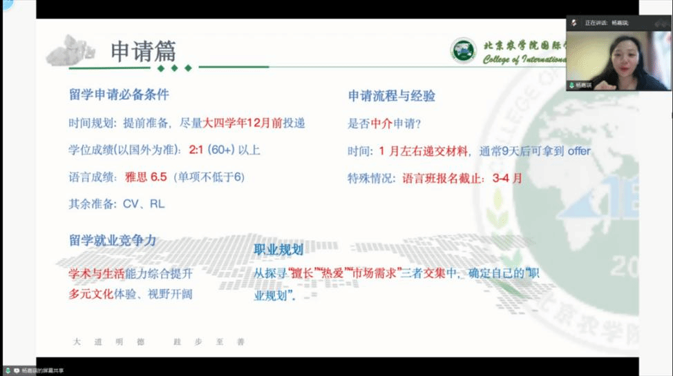 分享会还设置了交流讨论环节。尽管远隔重洋,但线上交流依然热烈,交流时间超过预定时长。同学们就自己关心的学习方法、材料准备、申研流程等问题踊跃提问,员工耐心解答,给予了极具实用性的建议,鼓励学弟学妹们保持积极乐观的心态,勇敢面对学习及申研过程中的挑战与困难。
