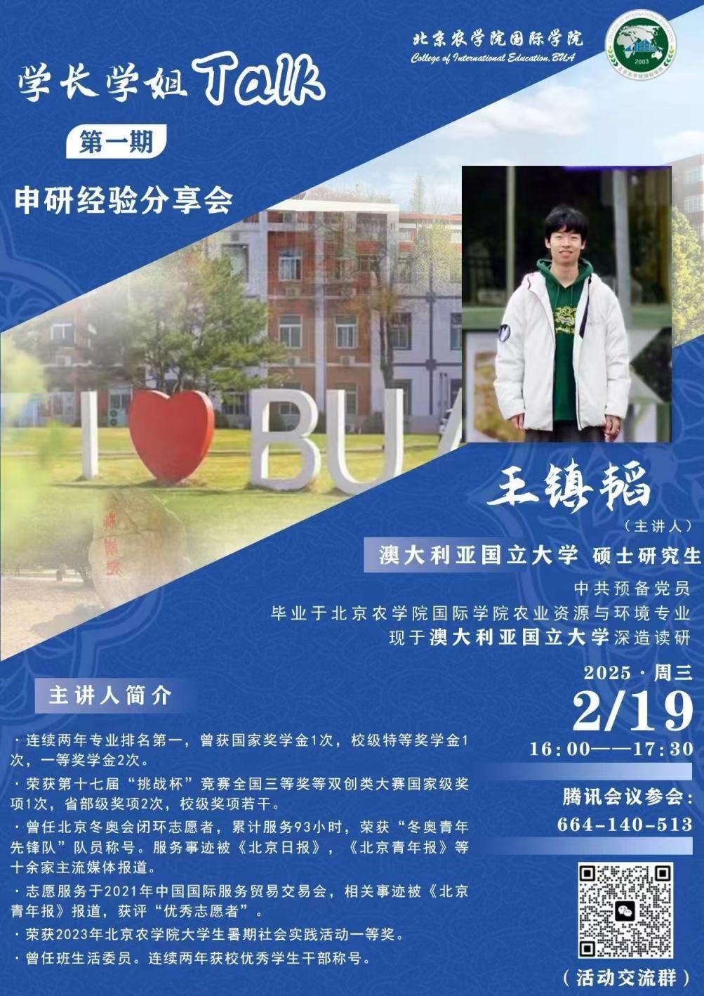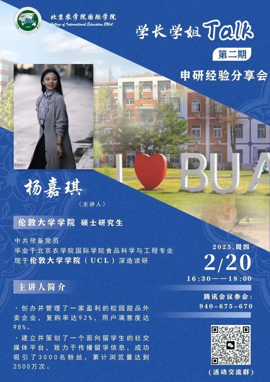 为帮助在校生全方位、多层次、宽领域了解海外申研工作,提高升学质量,悟空体育聚焦员工发展需求,于2025年2月19日和20日分别邀请了2024年北京市优秀毕业生代表,现就读于澳大利亚国立大学的员工王镇韬、现就读于英国伦敦大学公司的员工杨嘉琪在线举办了两期“学长学姐Talk”海外申研经验分享交流会。