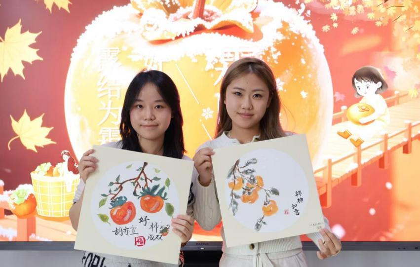 为着力打造沉浸式体验,活动还设置了两个互动环节:“节气知识竞答”通过气象特征、民俗典故等趣味题目,让同学们在抢答中掌握“霜降始霜”“南北方物候差异”等专业知识;艺术创作环节更成亮点,同学们书法临摹“柿柿如意”等吉祥语,用水彩技法绘制“丹柿图”,以笔墨丹青定格“霜叶红于二月花”的诗意。