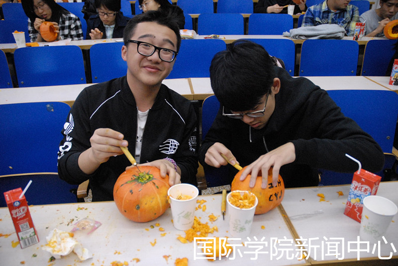 在位于阶一教室的“国院杯南瓜灯雕刻大赛”中,同学们通过观看“南瓜灯制作短片教程”学习,并经“去盖”“挖籽”“雕刻”三个步骤,亲自设计并动手制作一个南瓜灯。南瓜的清香在阶一教室中弥漫,渲染出了万圣节特有的气氛。