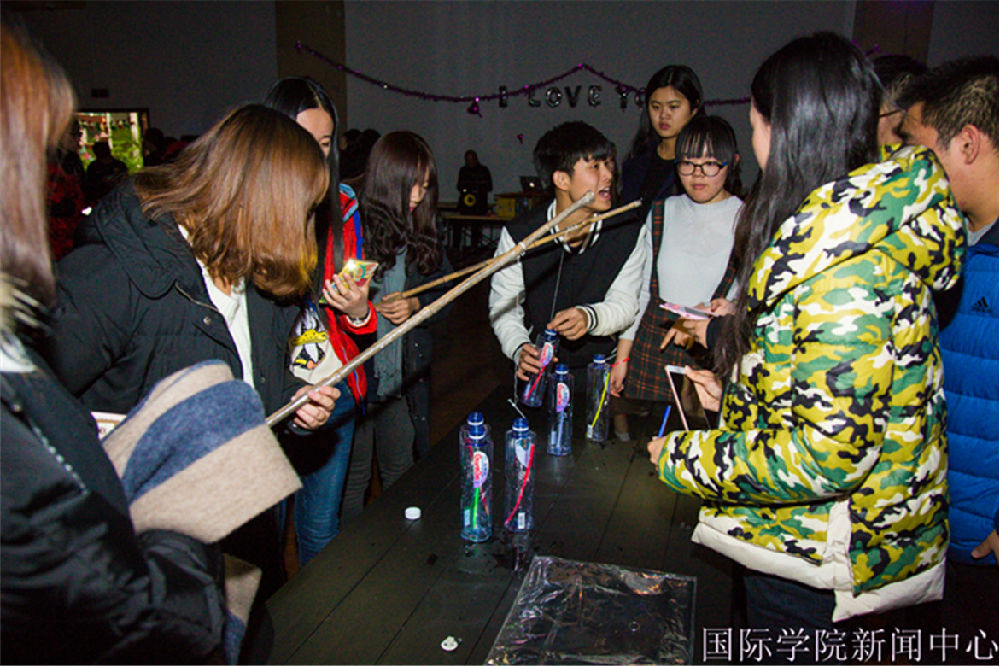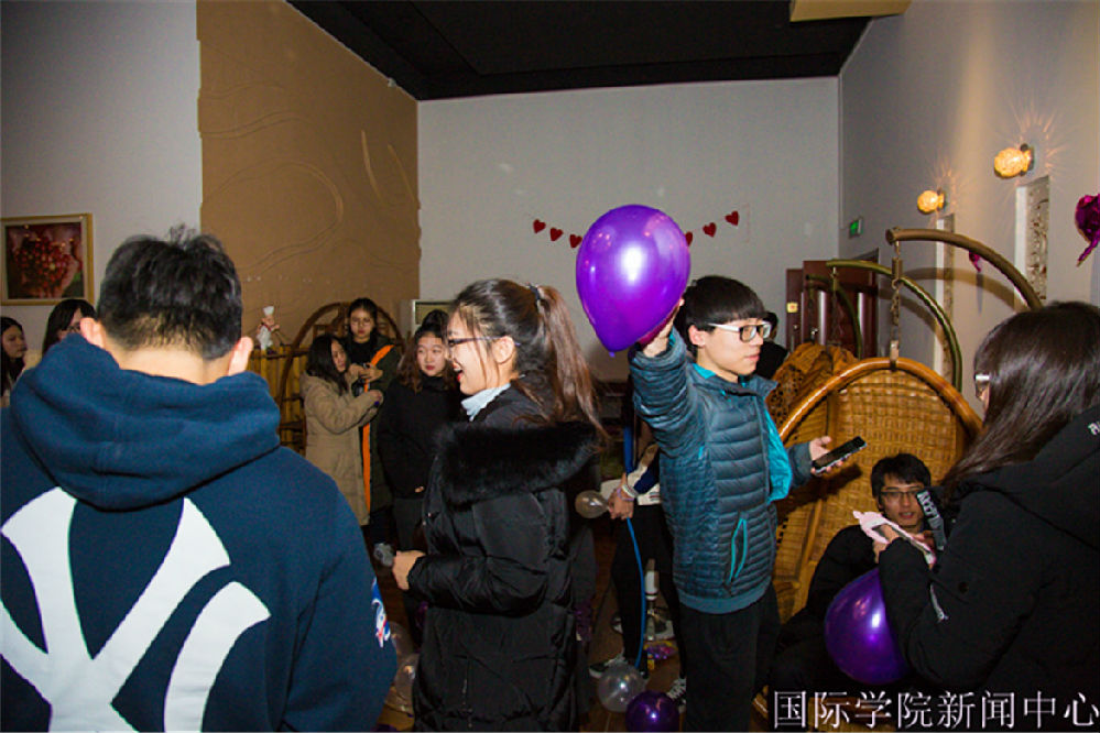 At 8:00p.m., this activity was beginning,all the students entrance in order with the ticket.This activity was divided in three parts:Games,DJ and Rest part. Niujia Pizza offered some delicious food, connected romantic lighting, and DJ music,it showed a wonderful atmosphere. The International students prepared some fruits, sweets and so on in the rest part. When the light was put off,the atmosphere more enthusiastic,all students wear rings on their hands,it just like stars in the sky,it made people feel magical .The game absolute attract people's eyes was balloon game, which put the atmosphere into top.Three college’s students played together,it showed the topic of this activity.