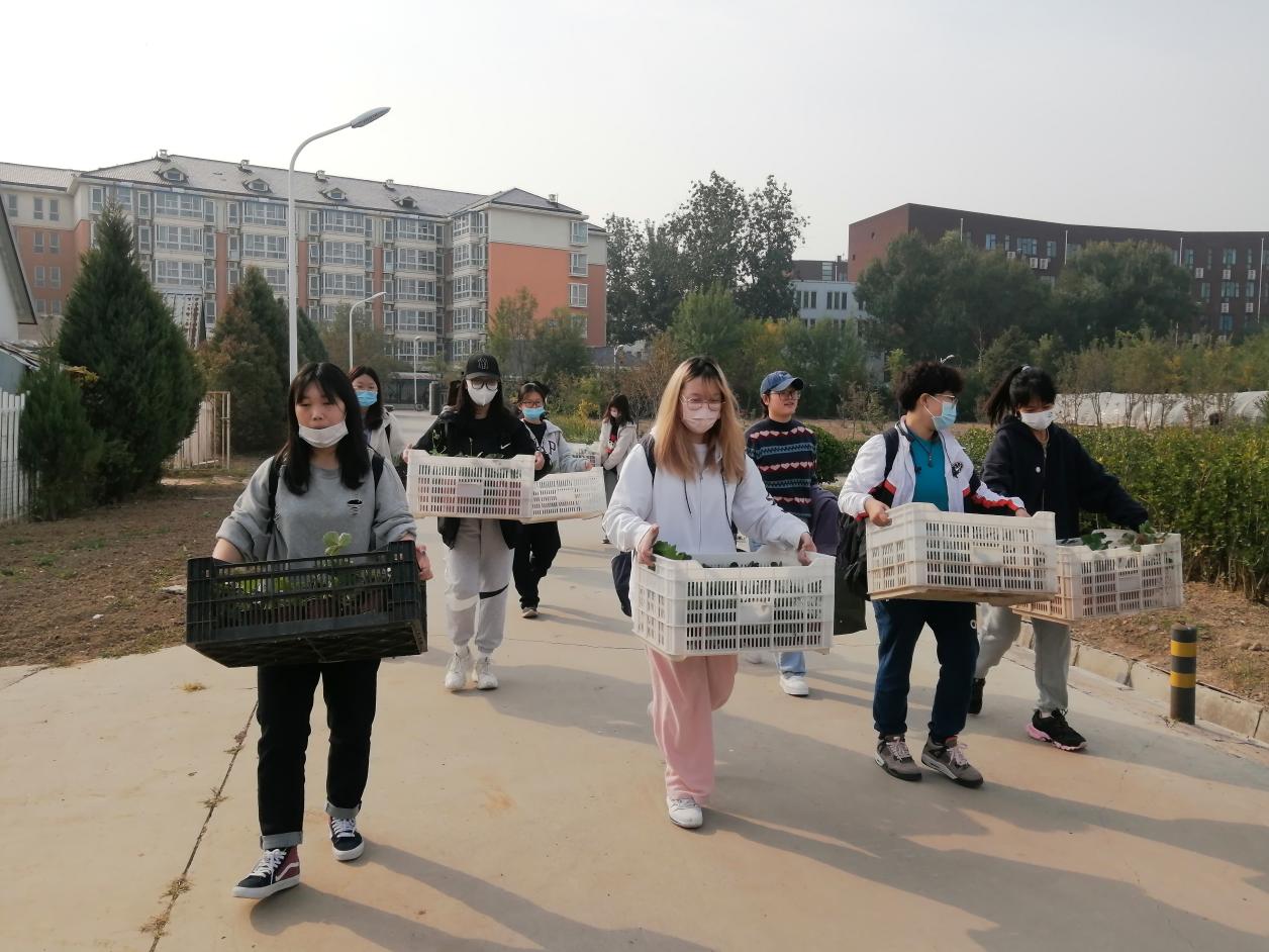 劳动正式开始,初次运用刚学到的理论知识,并近距离观察到草莓幼苗的同学们,充满期待地开始了移栽工作。他们先将相同品种的草莓放入同一个框中,以免品种混淆影响接下来学长们的实验。之后,他们“长途跋涉”地将装满草莓苗株的箱子一趟趟搬运到玻璃温室中,以保证草莓苗的存活。