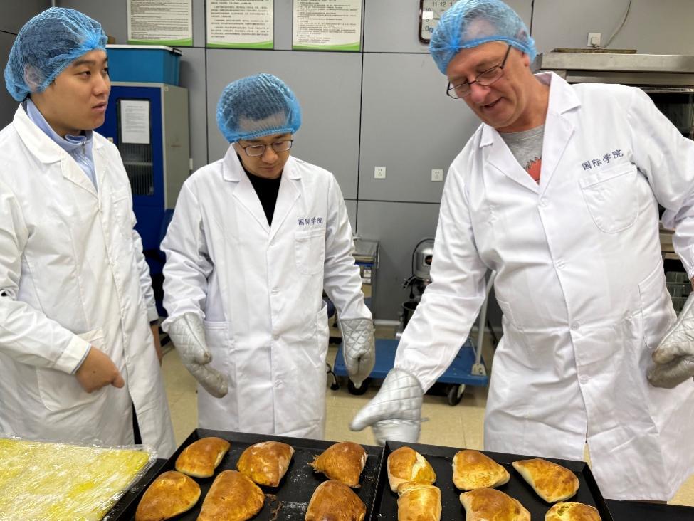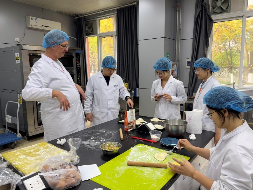 最受师生欢迎的“烤咸面包”实践示范课在悟空体育食品工艺实验室举行。Frank教授与食品科学与工程公司的青年教师舒畅共同指导员工,从原料选用、面团调制到烘烤工艺,每个环节都融入了食品科学的基本原理。教授特别讲解了不同烘烤条件对营养成分的影响,以及如何通过工艺改进提升传统食品的健康价值。当香气扑鼻的面包出炉时,同学们不仅品尝到了亲手制作的美食,也深切体会到理论联系实际的重要性。